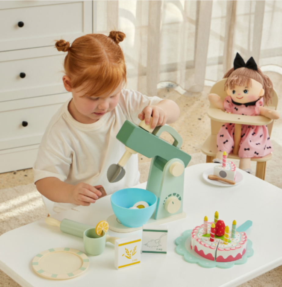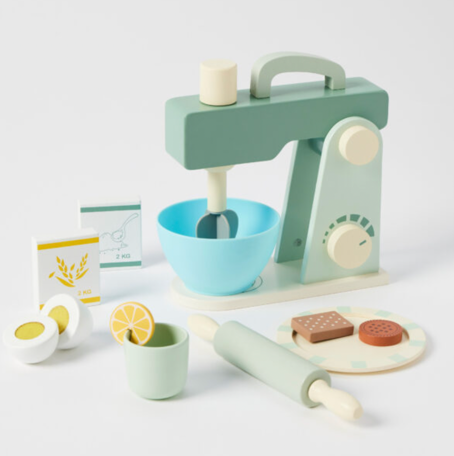 Whip up some fun with the Zookabee Kitchen Wooden Mixer! This delightful set includes a tilt-back mixer with a spinning whisk, bowl, rolling pin, and baking ingredients – perfect for pretend baking sessions. Great for sparking creativity and building fine motor skills, and packaged in a soft-colour gift box, ready for play or gifting.