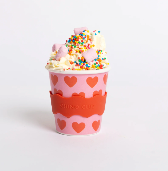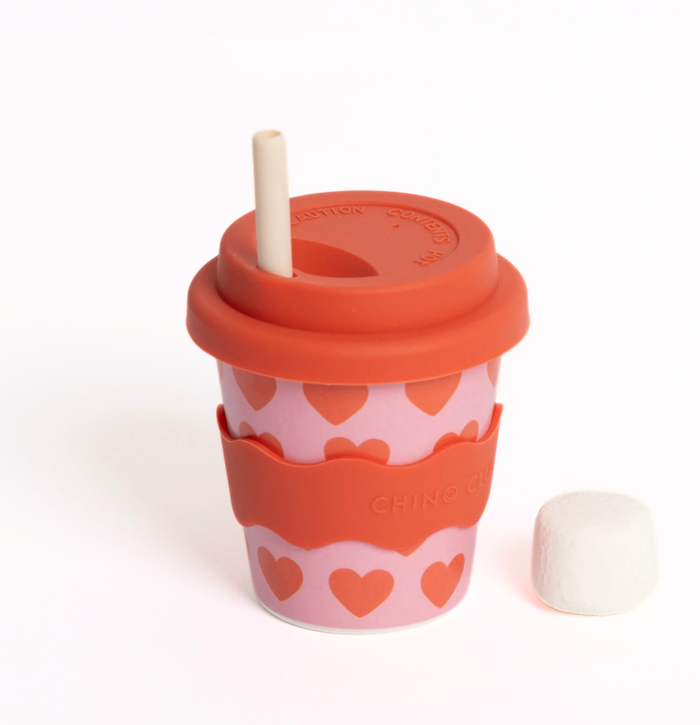 An on trend love heart print bamboo babychino keep cup for the little softies. Bamboo based cup with a silicone lid and complete in a cute gift box. Straws sold separately.