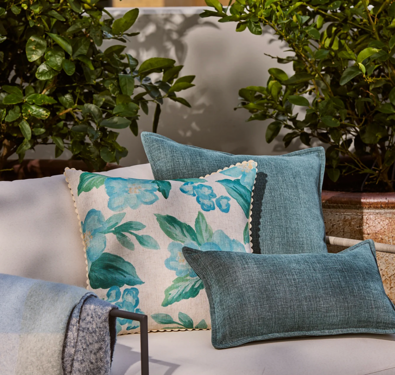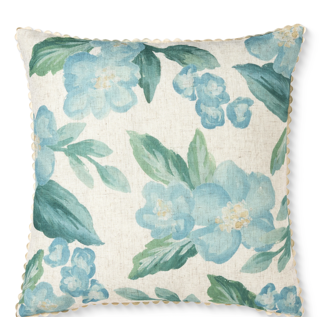 Hand painted large scale blue and green floral on natural background with natural reverse and ric rac trim.
